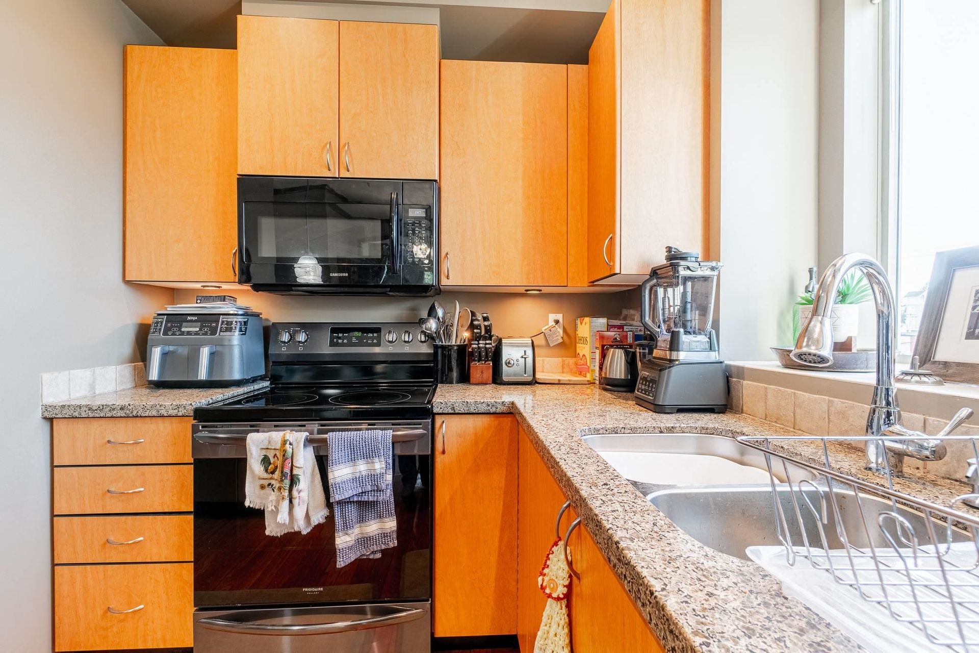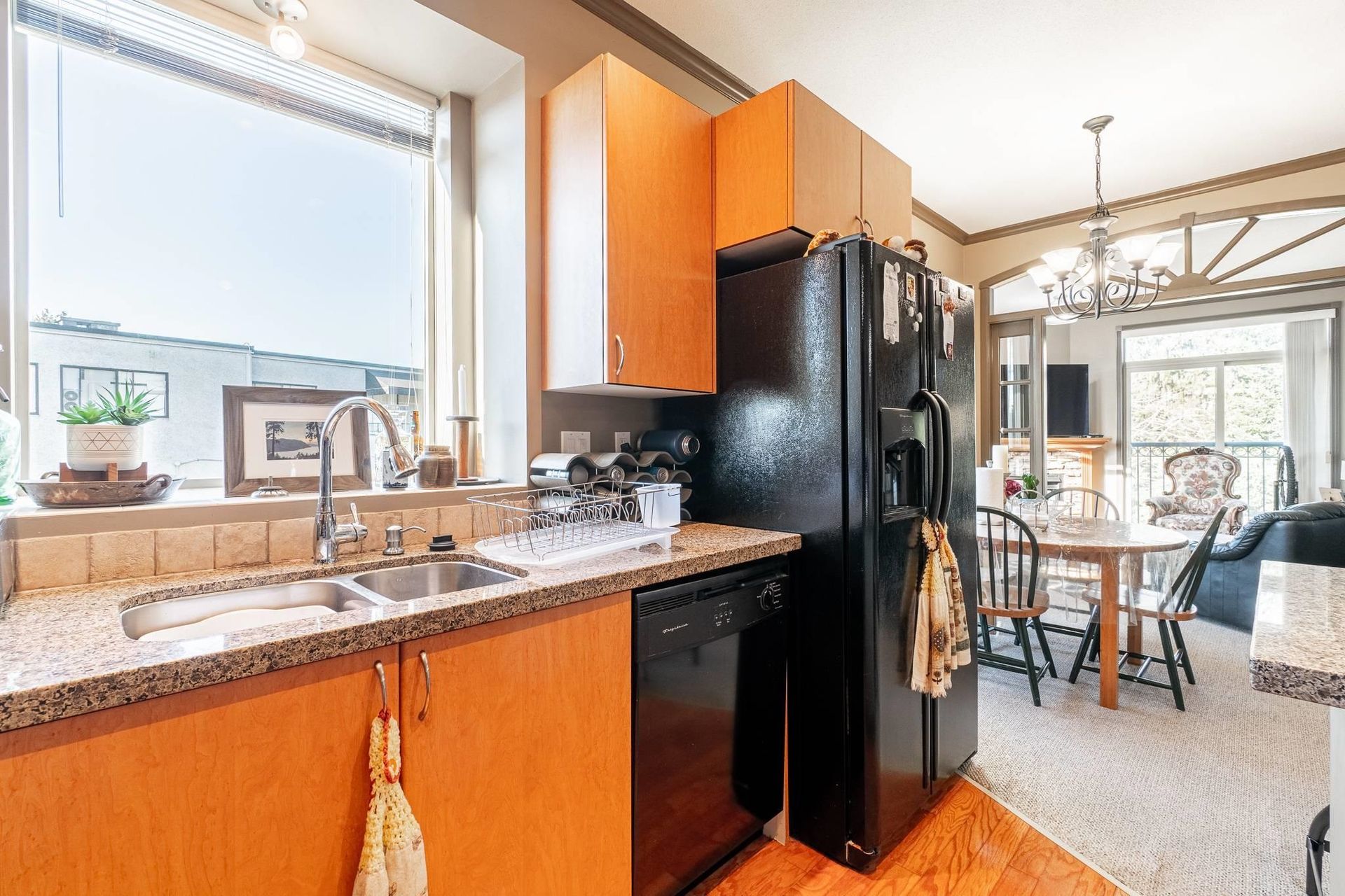 Welcome to Citadel Ridge in Central Abbotsford! Rarely available oversized END UNIT 1 Bedroom + 1 Bathroom located on the 3rd floor of this well built and secure building. Boasting 840 Sq Ft (not a typo!) this condo features a functional kitchen with granite countertops, island & window, large bedroom with AC unit and 2 closets, bathroom with double sink, shower and soaker tub, dining space, and also open living room with 2nd AC, wood mantle electric fireplace & 2 large slidi…ng doors that also allow tons of natural sunlight to shine through. Unit also features high ceilings, hardwood floors, and arched doorways. Best of all this unit offers a oversized single car private garage and also a storage locker. Low strata fees, 1 pet allowed and family friendly. Roof & gutters recently replaced!