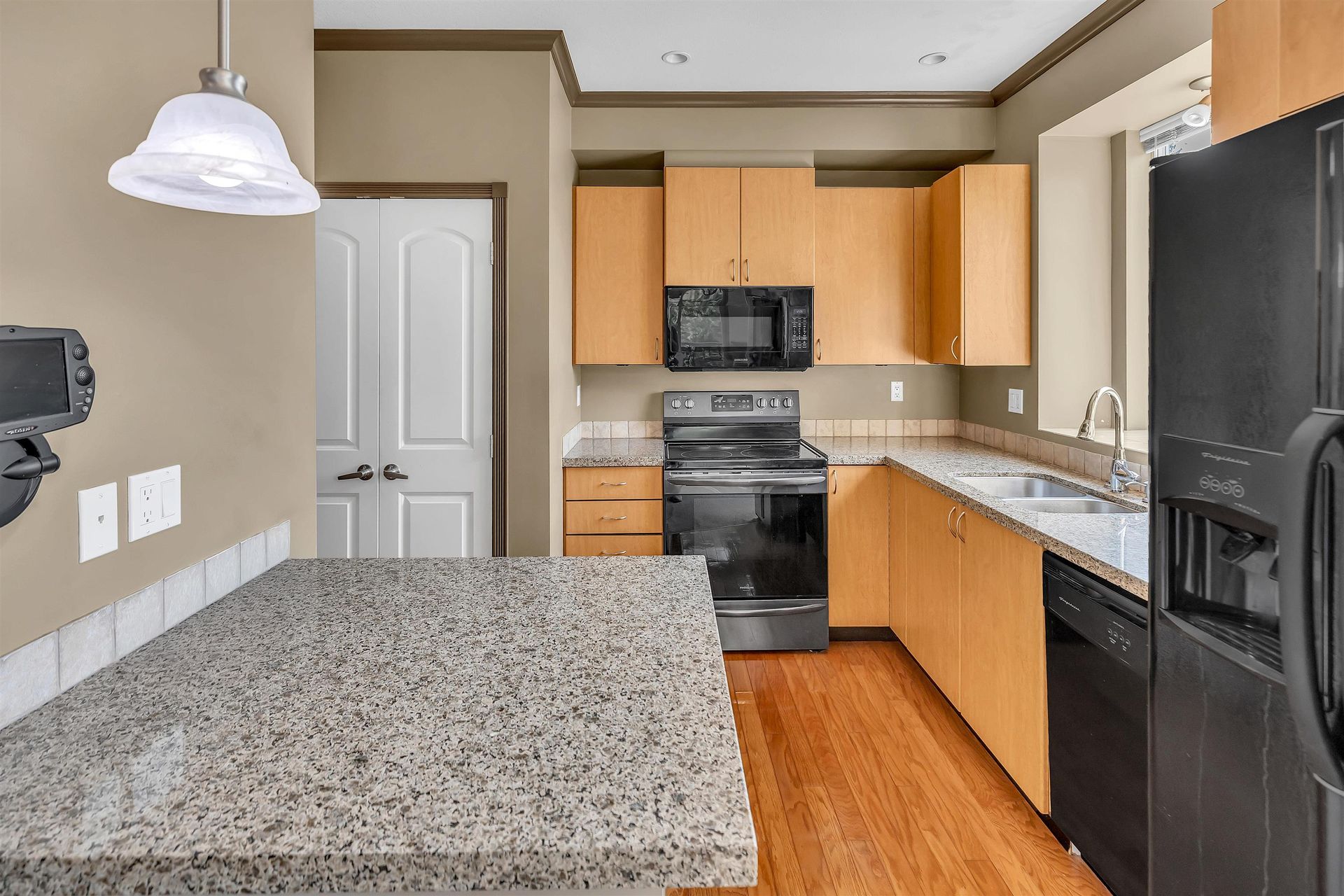 Welcome to Citadel Ridge in Central Abbotsford! Rarely available oversized END UNIT 1 Bedroom + 1 Bathroom located on the 3rd floor of this well built and secure building. Boasting 840 Sq Ft (not a typo!) this condo features a functional kitchen with granite countertops, island & window, large bedroom with AC unit and 2 closets, bathroom with double sink, shower and soaker tub, dining space, and also open living room with 2nd AC, wood mantle electric fireplace & 2 large slidi…ng doors that also allow tons of natural sunlight to shine through. Unit also features high ceilings, hardwood floors, and arched doorways. New washer/dryer. Best of all this unit offers a oversized single car private garage and also a storage locker. Low strata fees and 1 pet allowed. Roof & gutters recently replaced!
